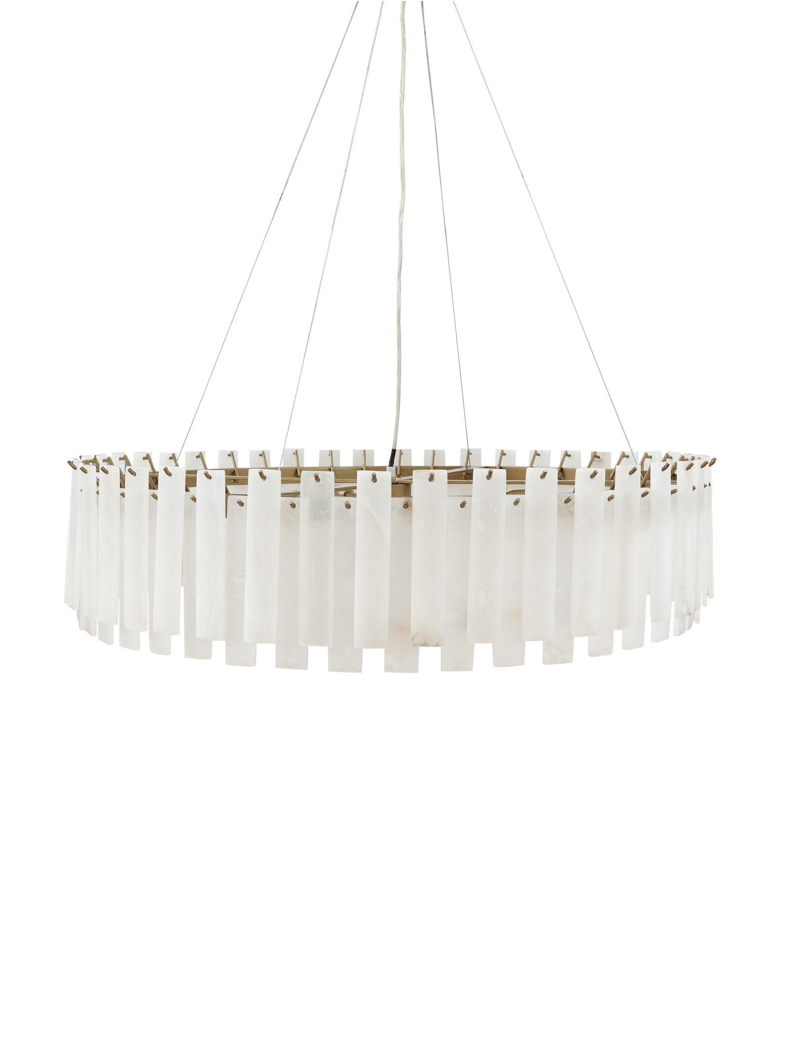 A sculptural, round chandelier combining iron and hand-selected alabaster panels. Warm light diffuses through the natural stone, creating depth, texture and a luxurious presence in contemporary interiors. Available in three sizes.