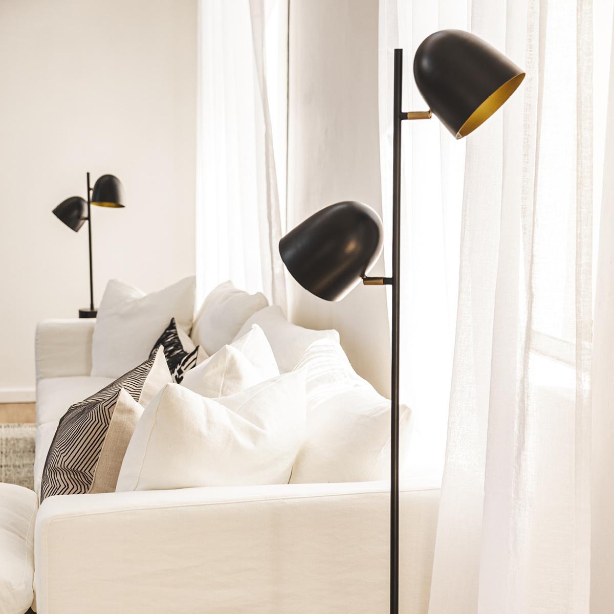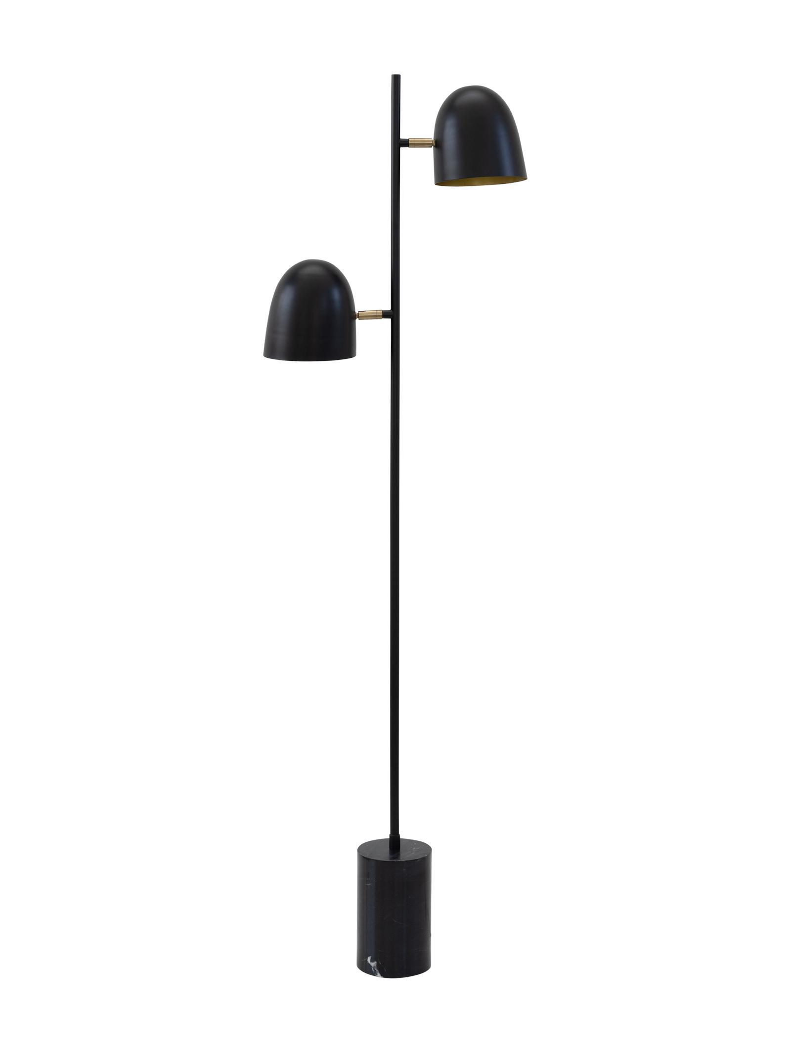 Crafted with the same artisanal care as the geometric version, the Handmade Black Marble Floor Lamp combines a grounding marble base with a slender black iron pole; elevating two curved, 45 degree angle-adjustable shades to provide versatile LED directional light. The gold interiors of the shades enhance warmth and reflection, while the staggered placement creates a balanced, sculptural composition.